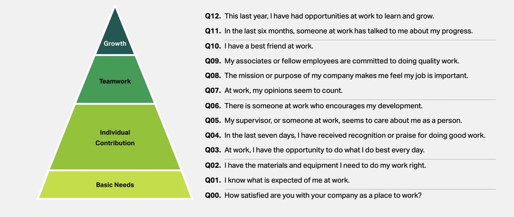 The Gallup Q12 is a list of 12 questions that give you insight into how connected and supported people are feeling at work. It focuses on high-level indicators that are relevant year in and year out, and the questions are practical enough that the survey results will lead you to specific, actionable insights.